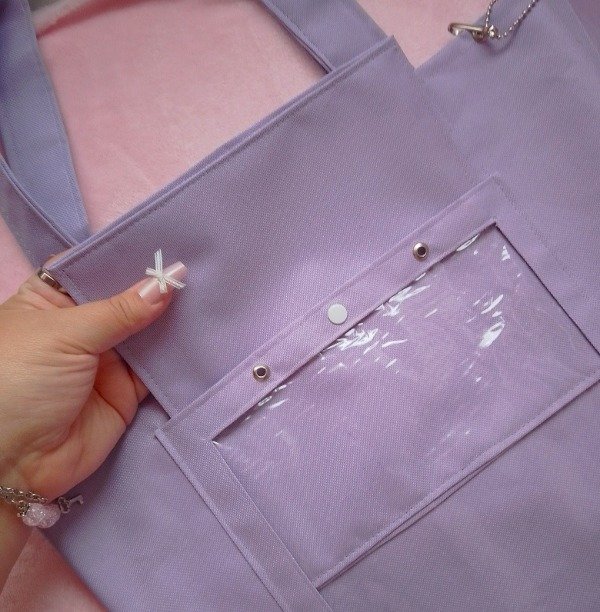 Totebag de lona con bolsillo transparente y accesorios para decorarla al estilo itabag! Cuenta con tres ojales en el borde, un ojal en cada tira delantera y dos en el bolsillo, el bolsillo también cuenta con un botón para mantenerlo cerrado. Incluye tres accesorios